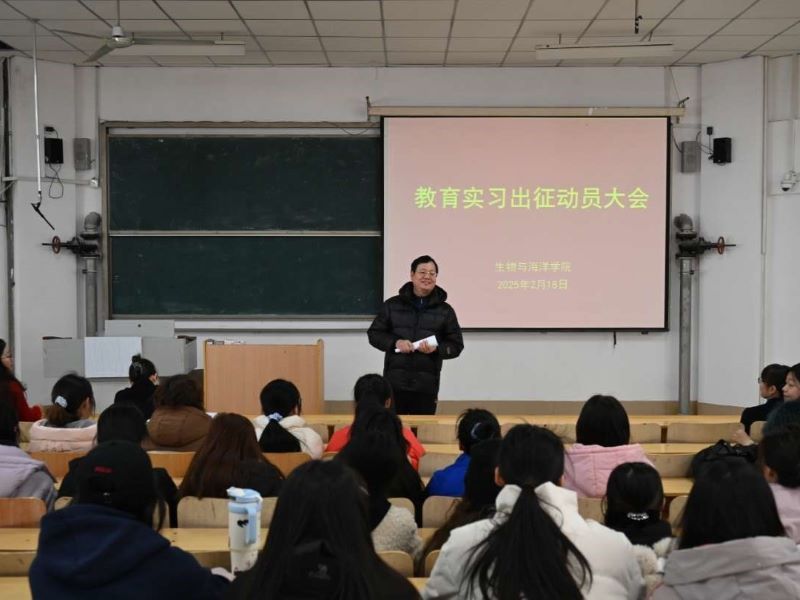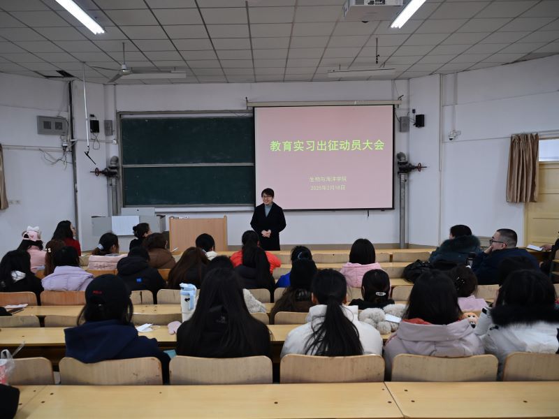 为顺利推进师范生教育实习工作,引导师范生进一步明确实习目的、细则和要求,生物与海洋学院2022级生物科学专业教育实习出征动员大会于2月18日上午在8514教室举行。院长许瑞瑞,副院长张淑芝,学工办主任孙海燕,辅导员戴玉镯,指导教师王汉海、隋美霞出席, 2022级生物科学专业全体学生参加。
