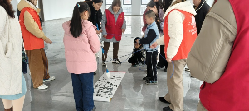 活动设置了多个充满趣味和教育意义的游戏环节。在 “二月二 龙抬头” 的互动中,小朋友们初步了解了传统民俗文化。接着是积木套圈游戏,志愿者与小朋友们齐心协力搭建积木、探讨套圈技巧,现场充满欢声笑语。合力牵绳写字游戏更是将活动氛围推向高潮,每组小朋友和志愿者分别拉住绳子的一端,通过控制力度让笔转动写字,用时最短的队伍获胜。过程中,志愿者们耐心指导小朋友如何掌控绳子,还细心安抚情绪着急的孩子,帮助他们稳定情绪。
