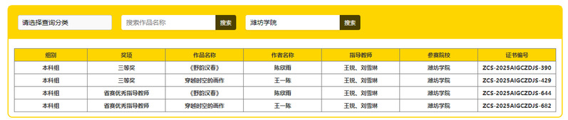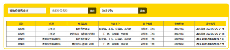 在生成式人工智能第一次计时赛中,学生邱亚鑫、王玉、马靖茹、高同新共创作品《智创青州瑰宝》、王一陈、陈欣雨、李淑淑的作品梦回北宋-《清明上河图》分别获国赛高校组三等奖;在第二次计时赛中,学生陈欣雨作品《野韵汉春》、王一陈作品《穿越时空的画作》获国赛高校组三等奖,教师王锐、刘雪琳分别获“省赛优秀指导老师”。