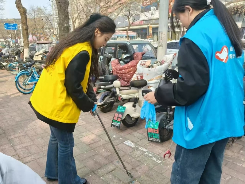 活动开始前,志愿者们身着黄马甲,向社区工作人员借来了扫帚、铲子、垃圾夹等工具,并做好分工。活动期间,志愿者们分别对社区内近千米的盲道展开全面清理。他们细心清除盲道上的落叶、碎石、违规停放的共享单车及占道杂物,并对沿线商户和居民开展文明宣传——“盲道是视障人士的‘眼睛’,占用盲道可能让他们的出行险象环生。”中学街社区作为繁华地段小区,临近大型商场,部分路段盲道被电动车遮挡,志愿者们两两一组将电动车推至安全停车区域。志愿者们的热情感染了周围群众,他们主动将电动车停放在指定位置,保证盲道畅通。