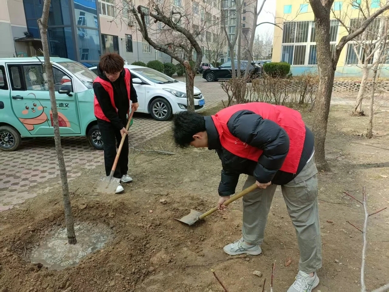 活动当天,志愿者们身着醒目的红色马甲,精神饱满地来到社区。在社区工作人员的精心组织下,志愿者们迅速分组,并投入到紧张而有序的植树工作中。他们挥锹铲土、扶苗填坑、培实新土、围堰浇水,每一道工序都做得认真细致。经过大家的共同努力,50余棵新树苗在社区的土地上扎根落户,为社区增添了一抹生机勃勃的绿色。
