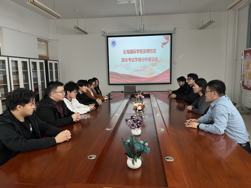 3月13日,北海国际学院在安顺校区6号楼3楼会议室召开期末考试学情分析座谈会,北海国际学院学工办主任姚灵忠、班主任老师王欣仙、优秀学生代表以及部分学习后进学生参加此次座谈会。