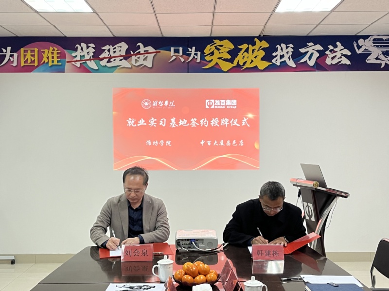 王成端代表学校分别向中国柳疃丝绸文化博物馆、昌邑中百大厦颁授“教学实践基地”“就业实习基地”牌匾。韩建栋向中国柳疃丝绸文化博物馆颁授“大学生创新创业实践基地”牌匾,并与相关企业签署共建教学实践基地和就业实习基地合作协议。