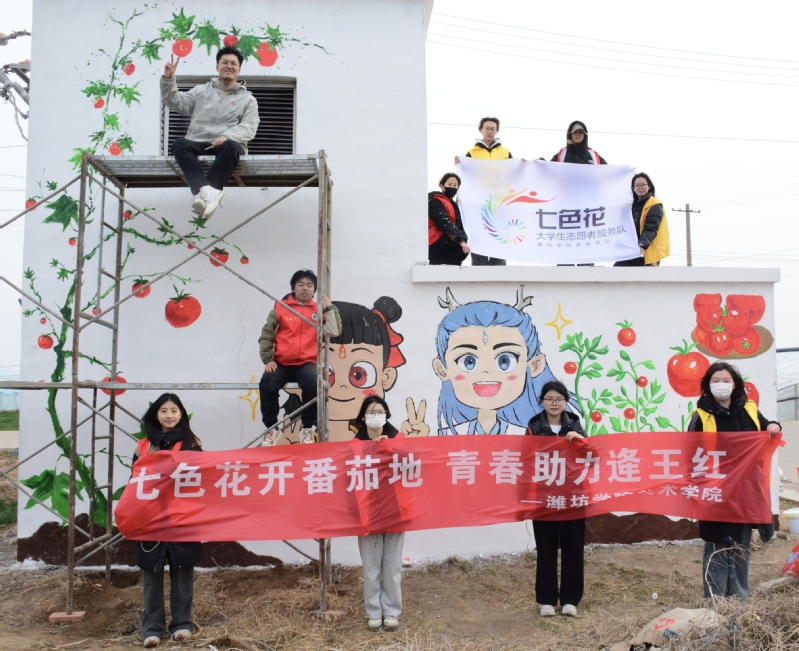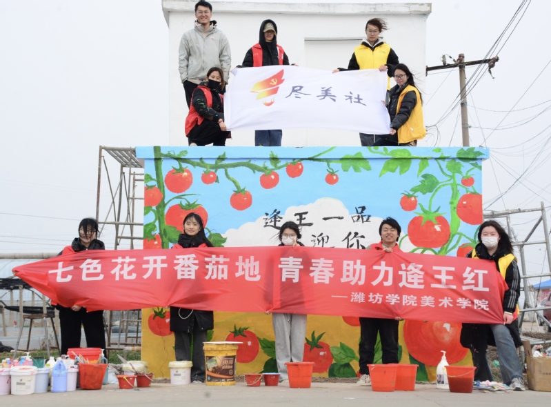 春风和煦,万物复苏,2025年3月15日,正值第七届“逄王一品”有机西红柿采摘节筹备之际,美术学院“七色花”大学生志愿服务队携手“尽美社”,走进潍坊市坊子区黄旗堡街道“逄王一品”有机西红柿园区,在辅导员肖文玉老师的带领下开展了特色墙绘活动,共同绘制乡村振兴的绚丽画卷。