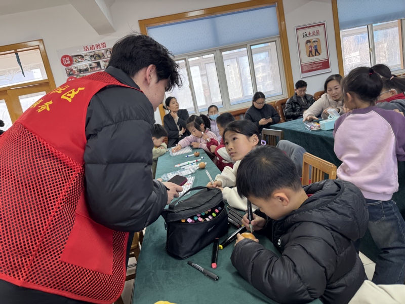 在“画蛋”环节,志愿者们与社区工作人员为每位小朋友分发熟鸡蛋、水彩颜料和画笔。“先用铅笔勾轮廓,再涂色会更立体哦!”志愿者们站在孩子们身边,手把手指导绘画技巧。孩子们充分发挥想象力,有的绘制憨态可掬的生肖图案,有的用彩虹色点缀蛋壳,还有的小朋友以青团、柳枝为元素创作“清明主题蛋”。