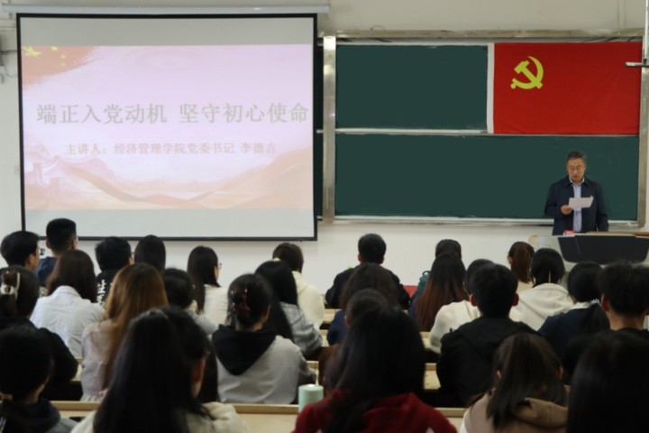 为加强入党积极分子的党性修养,提高政治觉悟,2025年4月10日,经济管理学院党委书记李德吉在致远楼401教室为2025年上半年入党积极分子讲授“端正入党动机,坚守初心使命”专题党课。