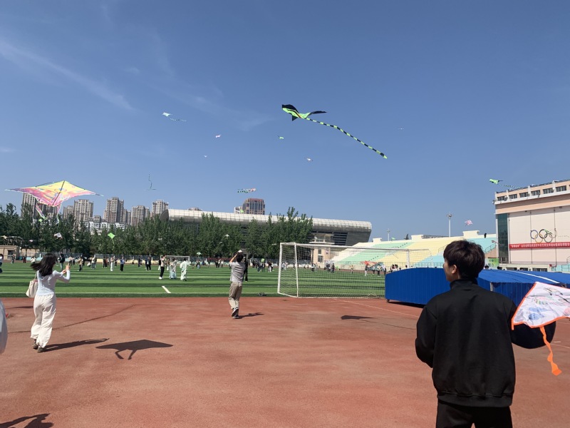 在“鸢舞蓝天・逐梦潍院”环节,同学们手持自己亲手制作的风筝,迎着春风,在操场上尽情奔跑、放线。只见一只只色彩斑斓、造型各异的风筝缓缓升空,在蓝天白云间翩翩起舞,形成一道绚丽多彩的风景线。这些风筝不仅承载着同学们的梦想与希望,更承载着对非遗文化的传承之心。