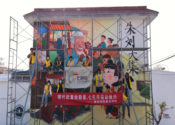 4月19日-20日,美术学院“七色花”大学生志愿者服务队与尽美社的10名同学,在肖文玉老师的带领下走进昌乐县朱刘西村,开展“哪吒赶集绘新景·七色传俗促振兴”主题墙绘活动。