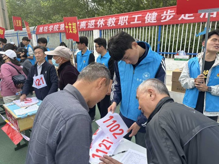 2025 年 4 月 27 日,为丰富离退休教职工的精神文化生活,倡导科学健身理念,促进身心健康,潍坊学院举办第六届离退休教职工健步走活动。为确保活动顺利进行,体育学院社会实践部组织志愿者为本次活动提供全程志愿服务。