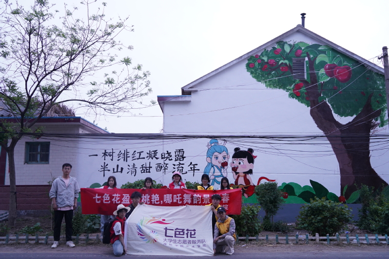4月27日,潍坊学院美术学院“七色花”大学生志愿者服务队携手尽美社在辅导员肖文玉老师的带领下,走进安丘市景芝镇樱桃园区开展创意墙绘活动。29名志愿者用画笔勾勒丰收盛景,用色彩传递乡村活力。