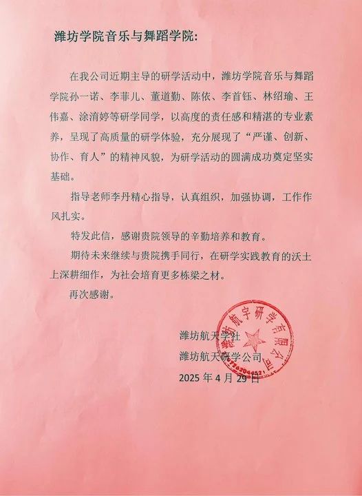 4月29日,潍坊学院音乐与舞蹈学院党员走进潍坊峡山航天航空科技馆,为昌乐县齐都实验学校六年级学生开展研学志愿服务活动,以生动有趣的方式点燃了孩子们心中的航天梦想,活动结束后,校方特致感谢信表达诚挚谢意。