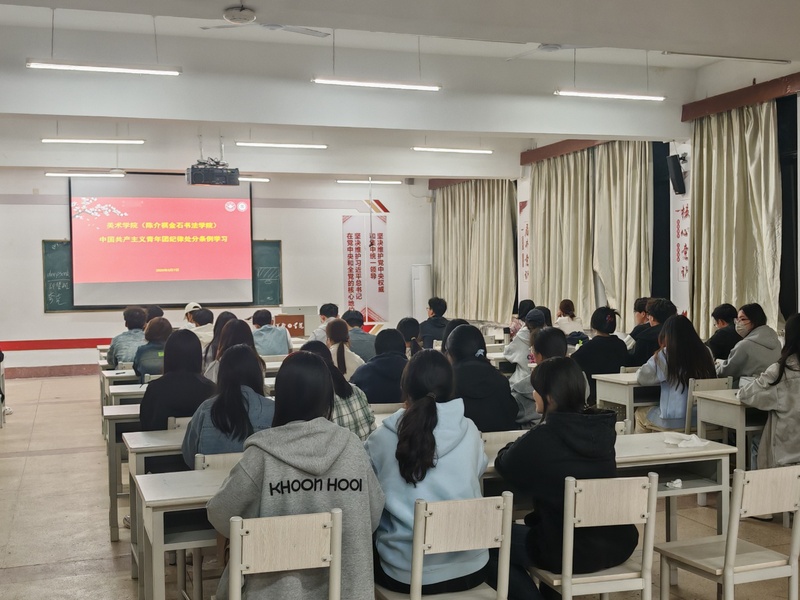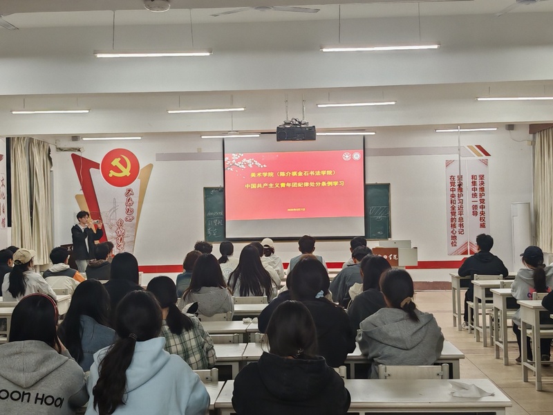 活动伊始,美术学院通过主题团日活动等形式展开学习。在主题团日活动中,团支书带领团员们逐章逐节研读条例内容,结合实际案例,详细讲解违纪行为的界定、处分类型以及纪律处分工作的规范流程。团员们认真记录、积极思考,就自己感兴趣的条款展开热烈讨论,现场学习氛围浓厚。团务部负责人深入剖析了团纪建设与党和国家事业发展的紧密联系,让团员们认识到严守团纪不仅是对自身的基本要求,更是践行时代使命的必然选择。