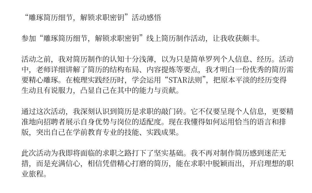 本次活动聚焦求职简历的规范性、专业性与创新性,通过系统化的指导与实操训练,引导学生在职业导师指导下完成个人求职简历创作,并撰写不少于300字的活动感悟。本次线上简历制作活动采取“自主创作+在线提交”的模式。学生上传个人简历及配套活动感悟,评审小组开展作品审核,重点核验简历信息真实性、结构完整性与求职匹配度,同步检查感悟文档的字数达标情况与内容原创性,最终将通过的100份合格作品进行集中展示。