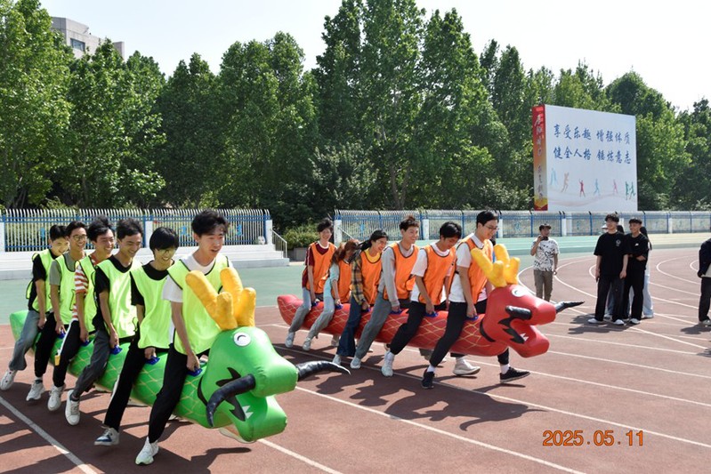 每支队伍派出6名队员跨坐充气“龙舟”,以整齐划一的步伐完成折返。有些队伍虽起步稍慢,但凭借后期加速实现逆袭,展现出当代大学生特有的爆发力。