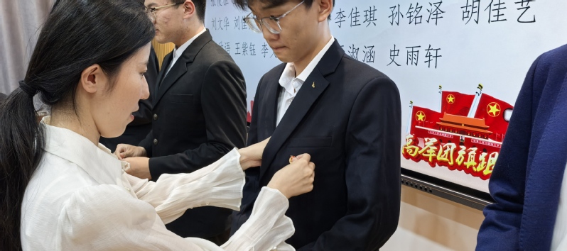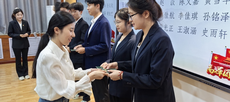 仪式在庄严的国歌声中拉开帷幕,全体人员肃立齐唱国歌。随后,赵文婷宣读2025年首批新发展团员名单。新团员们迈着坚定的步伐依次上台,赵文婷为其颁发团员证、佩戴团徽,象征着共青团精神的传承与责任的托付。