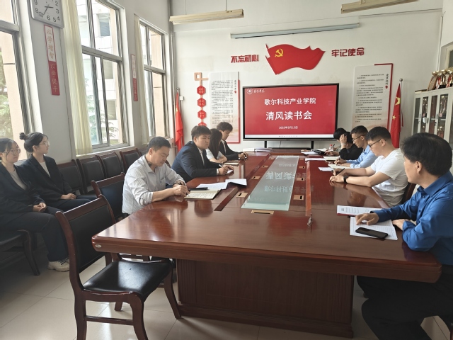 为扎实开展中央八项规定精神学习教育,全力构建校风清净、教风清正、学风清新的育人环境,5月15日下午,歌尔科技产业学院以“敬廉崇洁,诚信守纪”为主题在致远楼6216 会议室举办了“清风读书会”活动。本次活动由学院党委书记张付功主持,学院领导班子成员、党委理论学习中心组成员、学生党员代表参加了会议。
