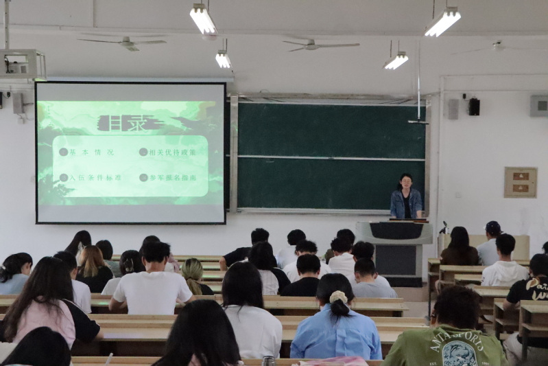 宣讲会上,孙婷婷凭借丰富的专业知识和对征兵政策的深入理解,从多个维度展开讲解。首先,她强调了大学生参军对于国防现代化建设的重要意义,阐述军队需要高素质人才注入新鲜血液,提升整体战斗力。随后,孙婷婷详细解读了征兵政策,涵盖报名时间、入伍条件、体检标准等基础信息,重点介绍了大学生参军的优惠政策,如学费补偿、考研加分、就业安置等。她通过列举往届学生参军后的发展案例,让同学们直观感受到参军不仅是报效祖国的光荣选择,也能为个人未来发展提供广阔空间。