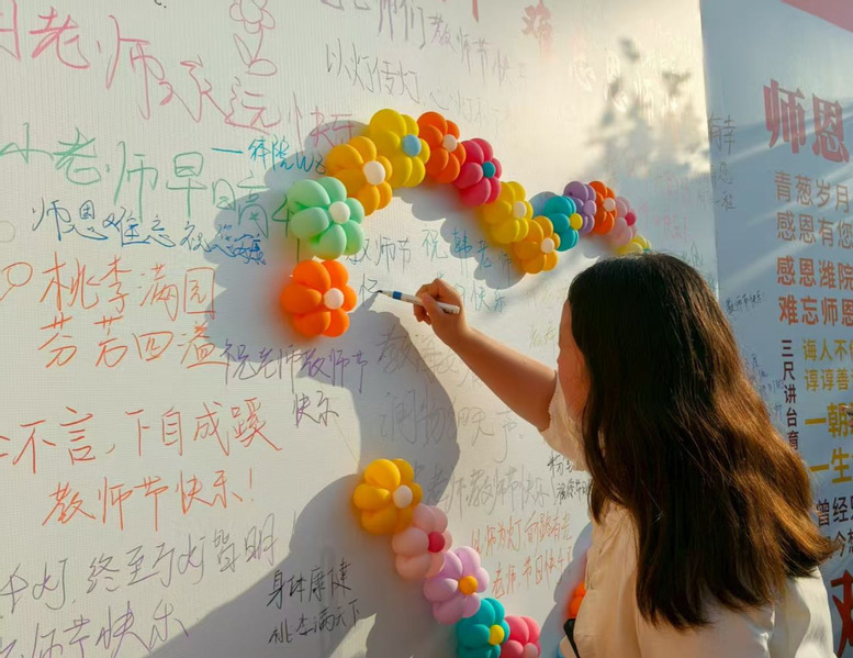 同学们踊跃参与在校图书馆前广场举行的祝福签字活动,笔墨传情,师恩难忘。同学们在展板上留下温暖话语,墨香氤氲中,一段段真挚留言汇集成动人的情感画卷,展现了数院学子崇教尚学的精神风貌和深厚情怀。
