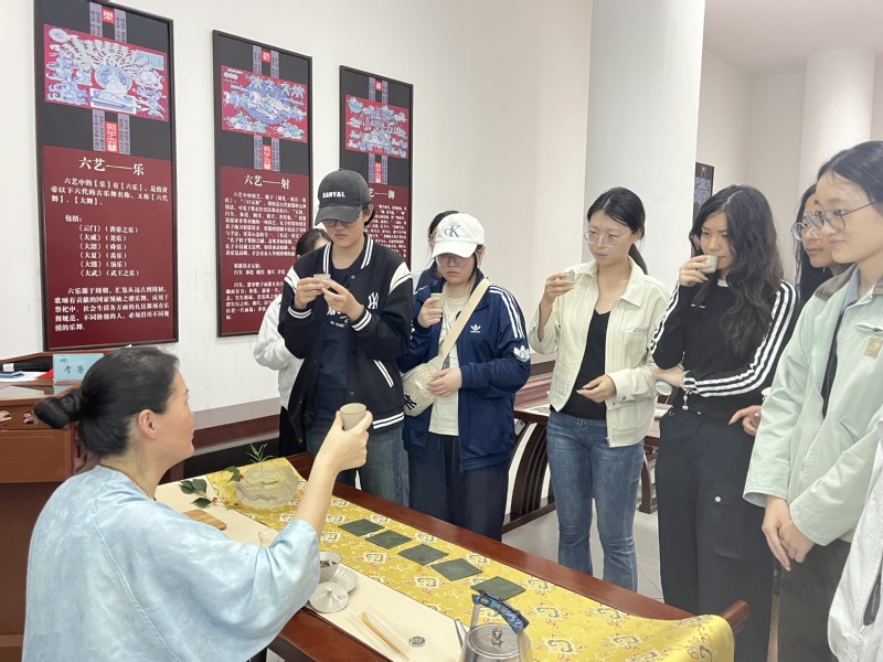 仪式后,文史学院师生参与了传统文化体验活动。茶艺专家米朵老师现场讲解茶文化,通过温杯、闻香、品鉴等环节,生动演绎中国茶道精髓。在场学生通过沉浸式体验,深刻感受“和敬清寂”的茶文化精神,这与文史学院长期开展的地域文化研究形成呼应。在金石传拓工作坊中,马兴建老师系统讲解这项传承千年的技艺,指导学生完成从审器、上纸到施墨的全流程操作。学生们在拓印实践中精准把握力道与宣纸贴合度,成功复现潍坊历史碑刻的精微细节,深化了对地方金石文化的认知。