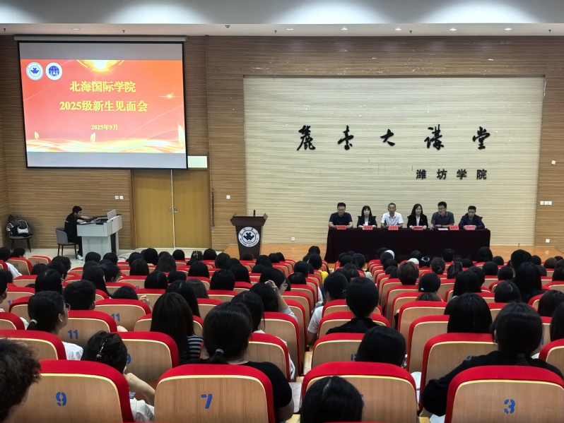 9月28日下午,北海国际学院2025级新生见面会在安顺校区3号楼四楼报告厅召开,学院党委书记兼院长韩建栋,党委副书记、副院长张晓丽出席会议,学院相关科室负责人、优秀学生代表以及2025级全体新生参加会议,见面会由学院学生工作办公室主任姚灵忠主持。