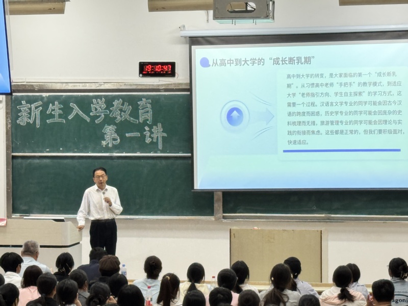 为落实立德树人根本任务,引导新生筑牢理想信念之基、把稳人生航行之舵,9月29日晚,文史学院(文化与旅游学院)于6101教室举行2025年级新生入学教育第一讲——与新同学共话大学生涯。本次活动作为新生启航大学旅程的“第一课”,由学院学术院长陈德正教授倾情主讲,党委书记范克文主持,全体2025级新生共同参与。