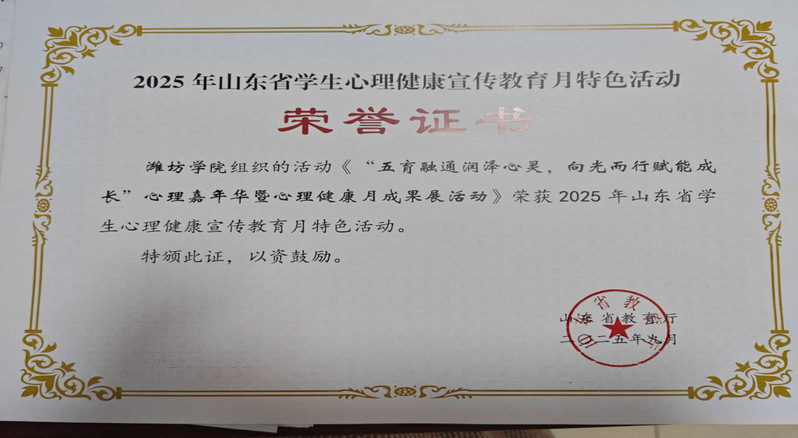据山东省教育厅公布2025年山东省学生心理健康宣传教育月系列活动评选结果公布。我校策划并实施的《“五育融通润泽心灵,向光而行赋能成长”心理嘉年华暨心理健康月成果展示活动》,凭借其创新性、实效性和广泛的参与度,荣获2025年山东省学生心理健康宣传教育月特色活动奖。