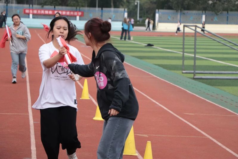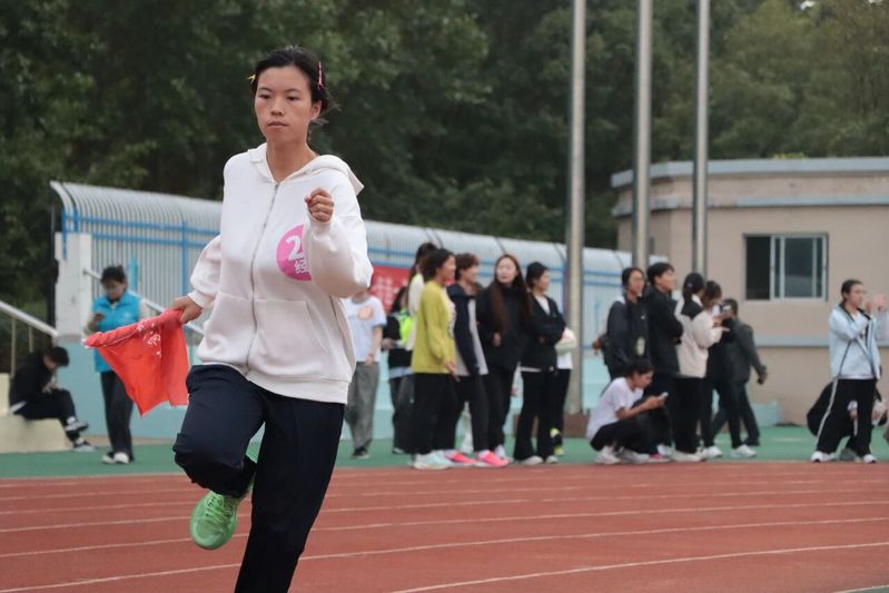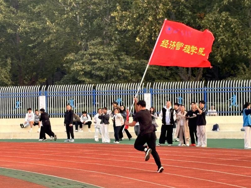 比赛采用74×400米的接力形式,接跑顺序为先女后男。哨声响起,第一棒运动员如离弦之箭冲出起跑线,每一棒队员在接力区内精准配合、奋力传递,展现了卓越的默契与协作。赛程中,运动员们你追我赶、挥洒汗水,看台观众的呐喊与掌声将现场气氛推向高潮。最后一棒队员高擎经济管理学院院旗全力冲刺,以昂扬姿态冲过终点,完成了这场意义非凡的“薪火”传承。
