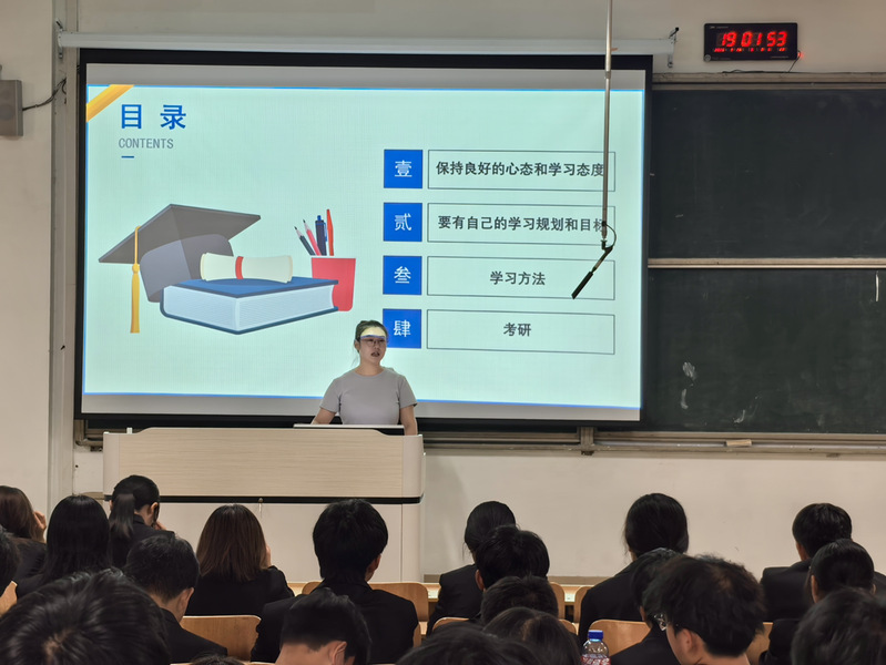 讲座中,郭怡萍围绕“保持良好心态与学习态度”“制定个性化学习规划”“掌握科学高效学习方法”“考研方向规划与前期准备”四个方面深入讲解。她结合专业学习特点,着重强调:“新生要从入学第一天起就树立规矩意识,自觉践行学风建设要求,既要严守课堂纪律、考勤纪律,更要主动培养自主学习能力,始终恪守学术诚信底线,共同打造勤学、善思、笃行、求真的优良学风。”同时,她还鼓励同学们立足时代发展需求,树立远大理想抱负,在深耕专业知识、锤炼过硬本领的基础上,积极参与学术研讨沙龙、志愿服务活动、特色社团实等,通过多元平台拓展视野、提升综合素养,让大学生活既充实饱满又富有意义,为未来升学、就业筑牢坚实基础。