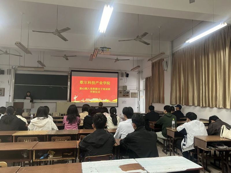 2025年10月19日,歌尔科技产业学院第43期入党积极分子培训班开班仪式在6206教室举行。学院党委副书记、副院长高连宏,辅导员庞文慧、宋卓及全体参训入党积极分子参加了本次仪式。
