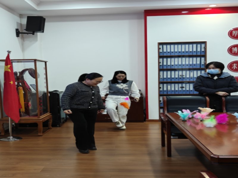 随后,进入“毽舞飞扬”环节中,师生手持花毽,在互动中体验传统体育的乐趣。从静观到动身,从展示到竞技,会议室里充满了欢声笑语。同学们在运动中释放压力,在协作中增进情谊,更在传统体育与非遗艺术的交相辉映中,感受传统文化生生不息的魅力。