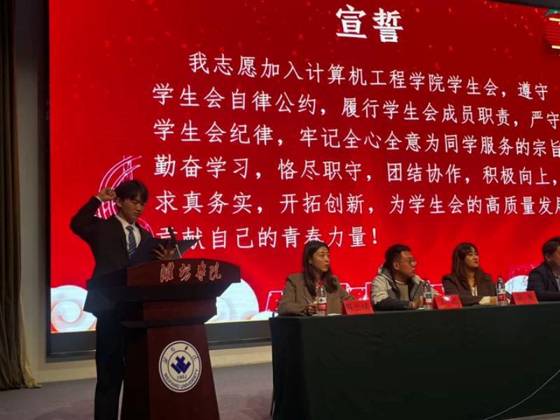 第二十五届学生会代表刘俊一同学上台发言,他号召新成员秉承“厚德、博学、求是、创新”的校训,发扬“和衷共济、艰苦奋斗、追求卓越”的潍院精神,牢记“全心全意为同学服务”的宗旨,明晰服务定位、筑牢团队根基、勇于开拓创新。相信新成员们会以青春之名扛起时代责任,在服务同学中成长成才,在接续奋斗中书写更加精彩的篇章,为学院发展注入蓬勃活力!