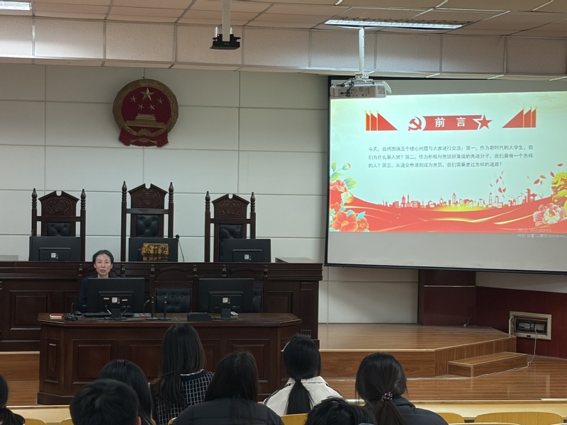 为加强对入党积极分子的培养教育,切实提高其政治理论素养和思想觉悟,严把党员发展“入口关”,2025年11月2日下午,法学院在8321模拟法庭为全体入党积极分子举办了一期启蒙教育专题党课。本次党课由学生第二党支部书记宋薇主讲。