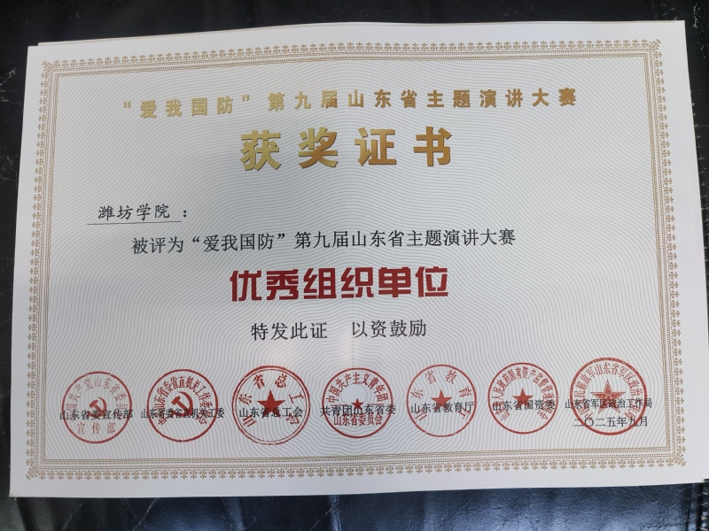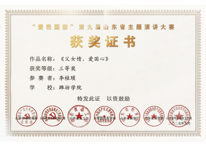 近日,由山东省委宣传部、教育厅等部门联合主办的第九届山东省“爱我国防”主题演讲大赛圆满落幕。我校传媒学院学生李桂顼凭借作品《父女情,爱国心》脱颖而出,斩获省级三等奖;学校因在赛事组织、选手培育等方面表现突出,被授予“优秀组织单位”荣誉称号,双项殊荣彰显了我校国防教育工作的扎实成效。