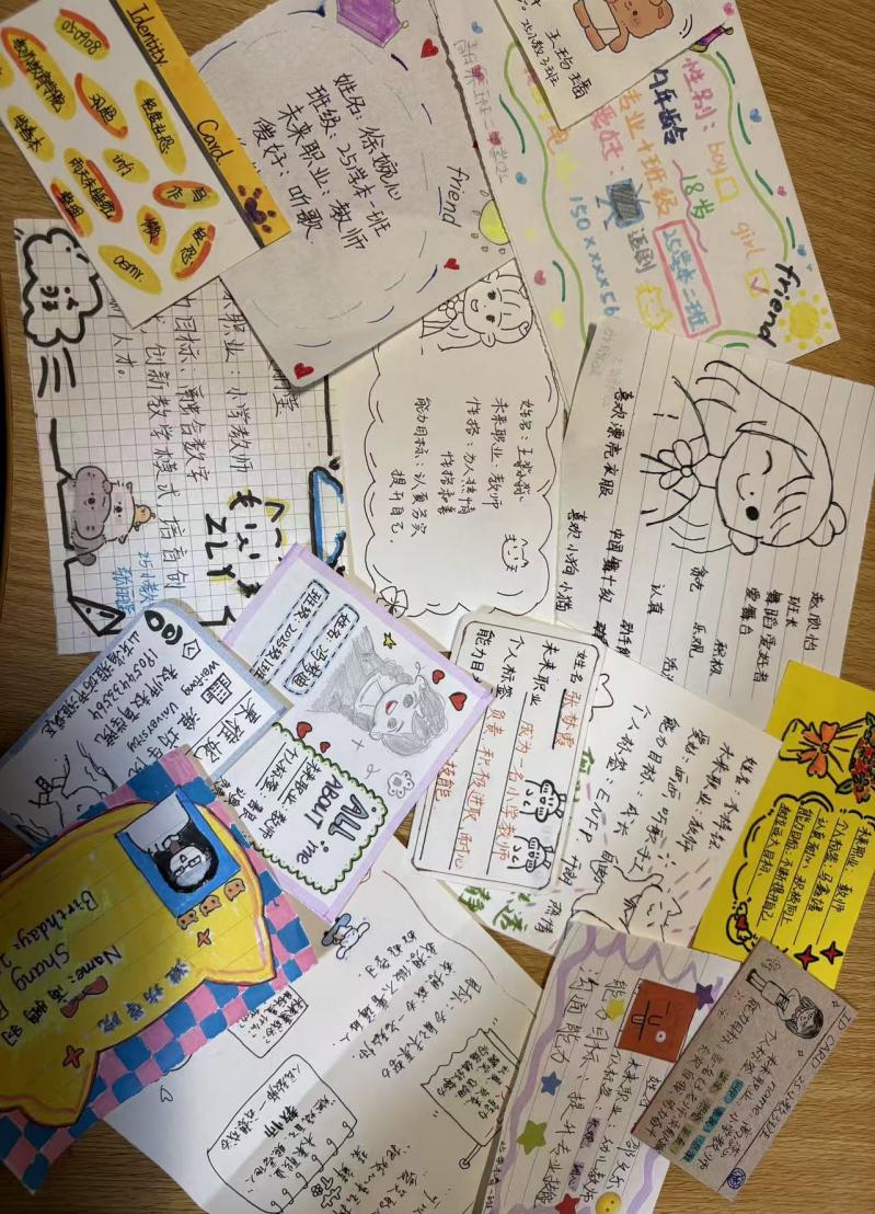 本次活动以“未来职业、个人标签、能力目标”为核心创作导向,为学生提供了多元化的创作空间。活动现场,同学们充分发挥想象力,运用不同材质的卡纸、色彩鲜明的彩笔、创意十足的贴纸等多种材料,将对未来的职业期许融入名片设计之中。有的同学以“幼儿教师”为职业目标,在名片上绘出童趣满满的卡通图案,标注“耐心共情”“艺术启蒙”等个人标签与“掌握幼儿心理学”“精通多元教学法”的能力目标;有的同学聚焦特教领域,用简洁的线条传递责任与关爱,以“特殊教育指导师”为方向,明确“专业素养”“沟通协作”的核心标签与技能提升计划。一张张风格迥异的创意名片,不仅是个性化的自我表达,更成为同学们梳理职业认知、规划学业路径的生动载体。每一张名片的背后,都凝聚着对未来的思考与期许。