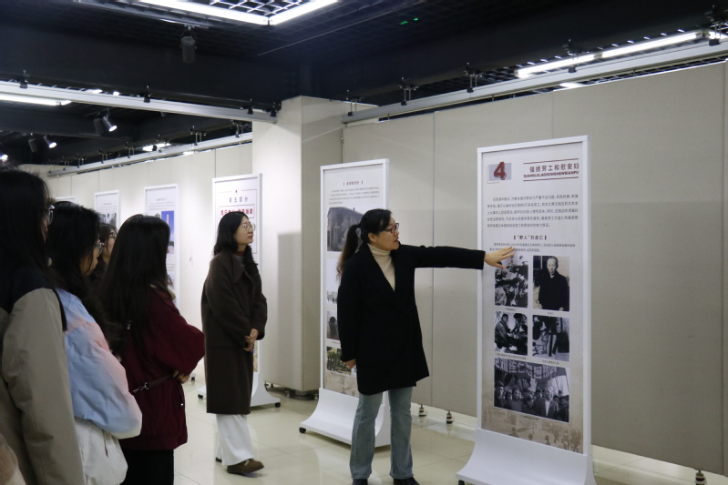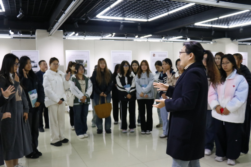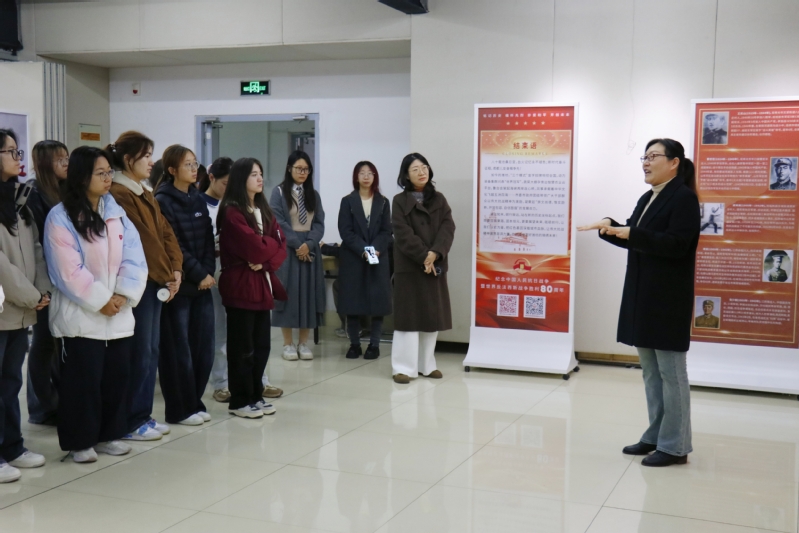 参观现场,张晓静结合展览内容,为师生梳理了从抗战全面爆发到潍坊地区军民奋起抗争,直至最终赢得胜利的历史脉络。她重点讲述了潍坊地区党组织领导抗日救亡运动、军民共建“渤海走廊”运输线以及抗日武装英勇斗争的事迹,并指出这段历史是新时代青年理想信念教育的宝贵资源。张晓静还勉励同学们要铭记历史,传承抗战精神,在未来传媒实践中坚守社会责任。