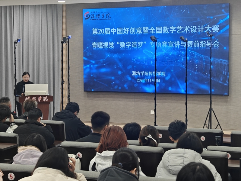 为深化数字创意人才培养,推动产学研深度融合,助力师生精准把握赛事核心要求,11月8日,第20届中国好创意暨全国数字艺术设计大赛青瞳视觉“数字造梦”专项赛潍坊学院站宣讲与赛前指导会在知新楼4210正式举行,大赛组委会代表和传媒学院各专业学生参加。
