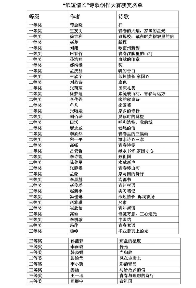 经课程教师与专业评委综合评审,最终评选出一等奖10名、二等奖15名、三等奖20名。获奖作品题材丰富、情感真挚,《杆》勾勒精神风骨,《青春的火焰,家园的星光》展现青年与时代同频共振姿态,《致母校:藏在时光褶皱里的信》传递深厚情感,尽显学生扎实文学素养与昂扬精神风貌。
