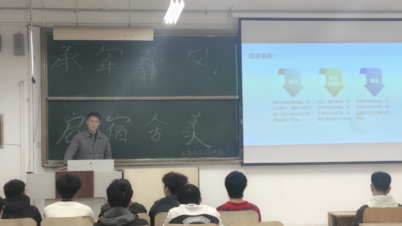 为充分发挥退役士兵同学的优良作风,以担当和自律树立鲜活榜样。我院于11月10日在致远楼6103教室顺利开展以“承军营风,启宿舍美”为主题的退役士兵示范引领活动。本次会议由王天南同学主持,2025级辅导员李权老师、全体退役士兵及各宿舍代表共同参会,活动围绕退役士兵朋辈引领、样板宿舍建设等议题展开。