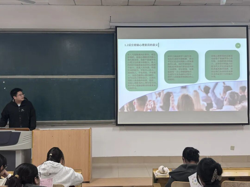 随后,赵晨羽围绕心理委员工作价值、心理健康基础知识、大学生常见心理问题及应对策略、核心工作职责等方面展开详细阐述。他着重强调工作中需坚守保密原则、实事求是态度与中立立场,要求严格保护同学隐私、客观反馈心理状况。针对大学生易出现的焦虑、自卑等心理困扰,赵晨羽深入剖析其表现与成因,分享切实可行的开导技巧与帮扶路径,为实际工作提供清晰指引。