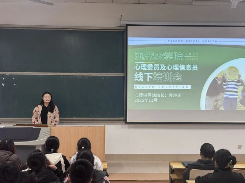 为进一步夯实学院心理健康教育工作基础,强化同学们对心理健康的重视程度,着力塑造自信友善、互助共进的班级心理氛围,筑牢校园心理健康“第一道防线”,11月10日,现代农学院于8504教室成功举办心理委员及心理信息员专题培训会。学院心理辅导站站长袁晓涵、心理与权益部负责人赵晨羽与全体心理委员、心理信息员共同参与了此次培训。