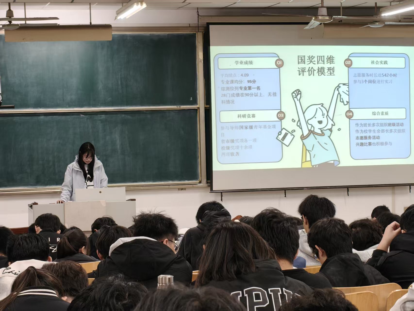最后,魏英姿、杨越越两位国家奖学金获得者,分享了科研竞赛与奖学金申请的“通关攻略”。她们从科研项目选题、团队协作技巧,到竞赛备赛节奏、论文撰写要点,再到奖学金申请的核心准备,每一步都讲得细致具体,鼓励同学们多尝试、敢突破,提高了同学们学习的积极性和主动性。
