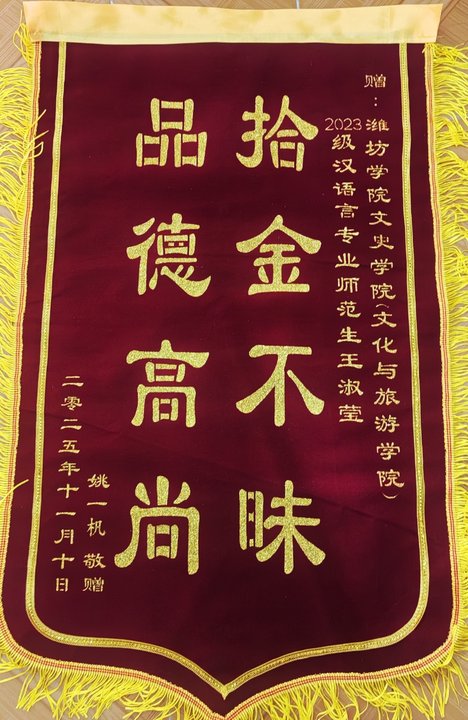 11月19日,潍坊学院文史学院(文化与旅游学院)2023级汉语言文学3班师王淑莹同学在寿光实验小学实习期间,以一桩拾金不昧的善举温暖了人心,用实际行动践行了当代大学生的责任与担当。