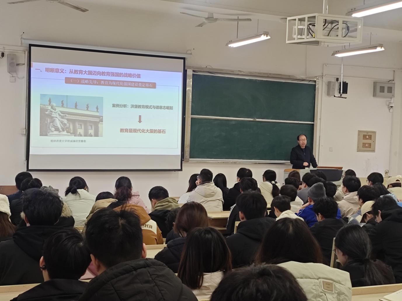 在此次思政课上,李英德指出教育是民族振兴、社会进步的重要基石,从教育大国向教育强国迈进,是实现中华民族伟大复兴的关键一步。他围绕四个方面对教育强国建设进行了深度的剖析,一是明晰意义:从教育大国迈向教育强国的战略价值;二是审视当下:教育从“大”到“强”的优势与挑战;三是锚定方向:建设教育强国的核心任务与高校行动;四是聚力未来:青年学生在教育强国建设中的使命担当。