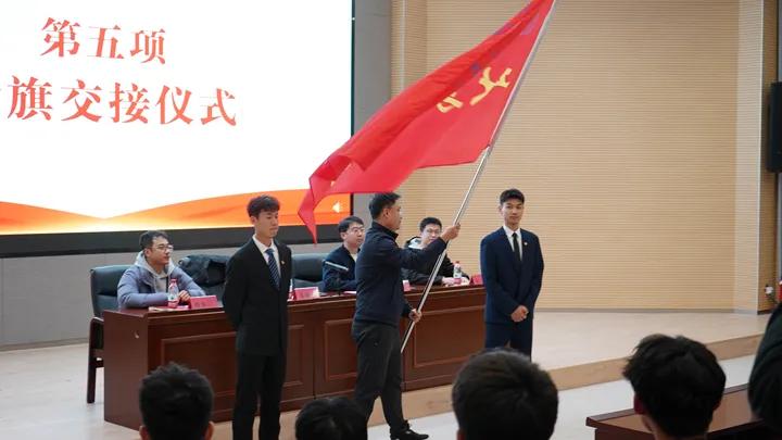 在热烈的掌声中,学院学工办主任马俊原与新老两届学生会执行主席上台交接会旗,鲜红的会旗象征着精神的传承与事业的延续,也标志着学院学生工作迈入新的发展阶段。