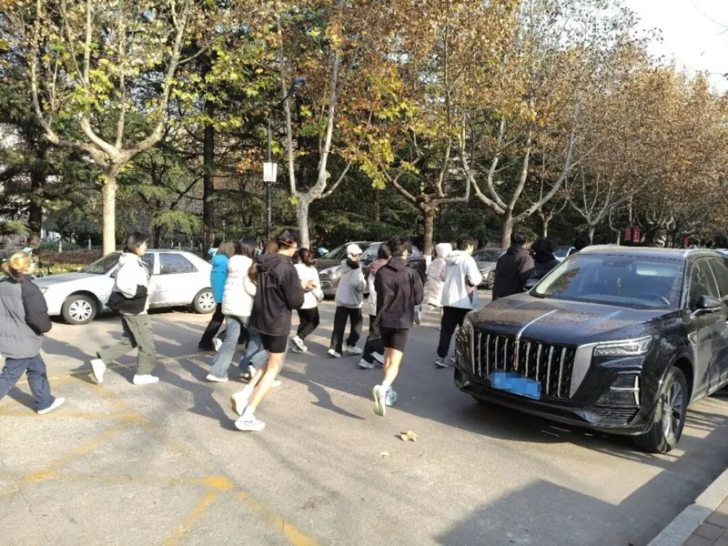 比赛以人合楼(8号楼)为起终点,选手沿校园主干道、图书馆等区域的红线赛道绕行三圈。沿途设补给站与医疗点,配备举旗、加油、计时等工作人员,保障赛事安全有序。