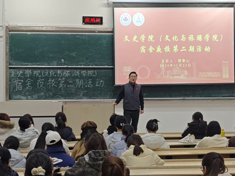 为提升学生宿舍管理水平、引导养成良好住宿习惯,11月23日晚,文史学院(文化与旅游学院)大学生自律委中心在6101教室开展“宿舍夜校”第二期活动。本次活动将制度宣讲与实操指导相融合,特邀郭泰山老师主讲,23-25级舍长、班长参与听讲,助力营造安全整洁的住宿环境。