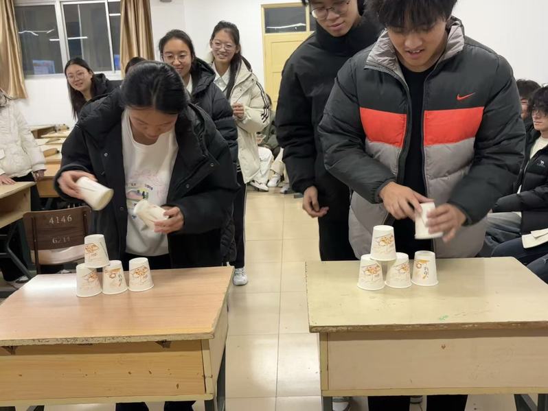 活动开篇,“纸杯叠罗汉”“抓手指”两个趣味游戏率先打破沉闷。同学们围坐成圈,在“叠纸杯比速度”的协作中培养默契,在“听指令抓手指”的互动中笑声不断。简单有趣的游戏不仅快速拉近了彼此距离,更让现场氛围变得轻松热烈,为后续心理健康交流筑牢了温暖基础。游戏结束后,班级心理委员结合校园生活实际,围绕“心理健康核心内涵”展开分享。从“如何通过睡眠、情绪变化识别压力信号”,到“用‘深呼吸法’‘情绪日记’调节焦虑”,再到“校园心理咨询资源的获取方式”,每一个知识点都搭配具体案例,让抽象的心理知识变得易懂实用。讲解过程中,同学们主动举手分享自己的“压力小困扰”,其他同学则热情支招,现场交流氛围融洽又真诚。