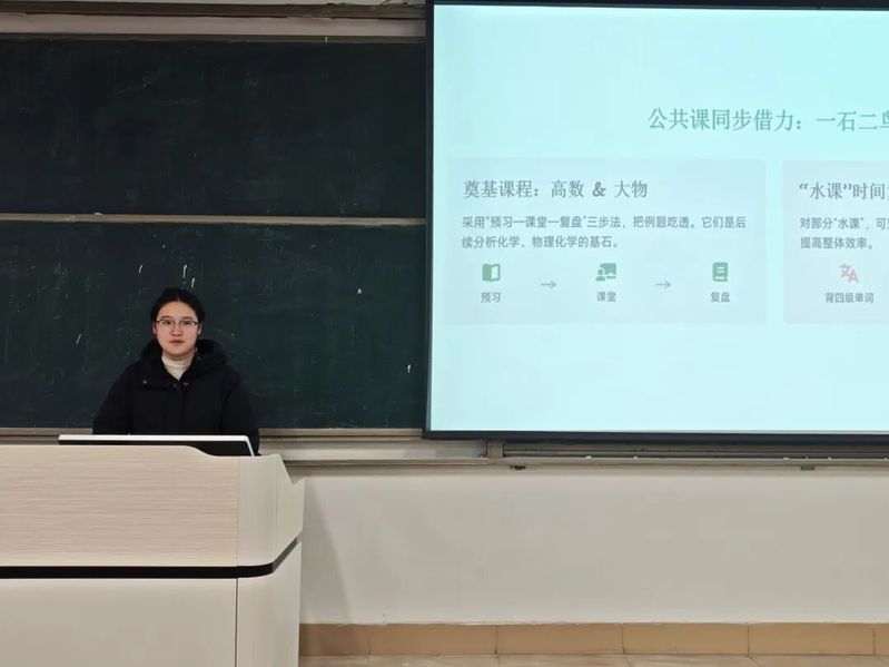 针对高数、英语等重点基础学科,2023级化工1班石浩喆结合自身备考英语四级的经历,分享了“词根词缀记忆法”“真题高频考点归纳”等实用技巧,还推荐了多位深耕高数、英语教学的优质网课老师,为新生攻克学科难点提供具体参考。2023级环境工程1班苏雪直击“时间管理”痛点,通过“课程优先级分类表”“碎片时间任务清单”等工具,生动拆解如何平衡专业学习与社团活动,让“忙而不乱”的时间管理逻辑变得可学可用。