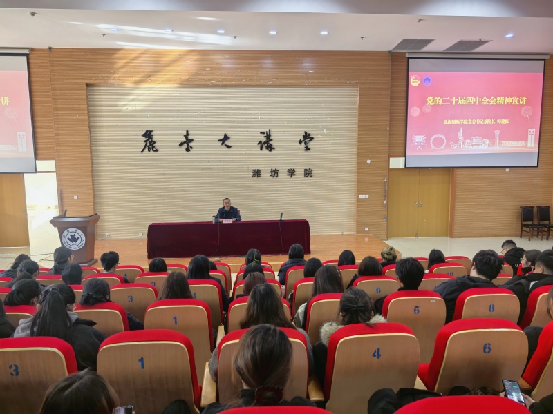 11月26日,北海国际学院在安顺校区3号楼4楼报告厅开展党的二十届四中全会精神宣讲“书记第一讲”活动,由学院党委书记兼院长韩建栋主讲,2024、2025级学生骨干参与。