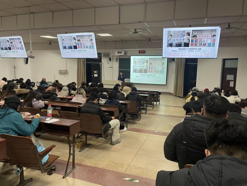 讲座中,李瑞东结合当前教育发展趋势与升学市场动态,针对考研和出国留学两大方向进行了系统讲解。在考研板块,他详细解读了近年硕士研究生招考政策变化、热门专业报考趋势及院校选择技巧,强调“院校选择需结合自身实力与职业规划,避免盲目追高”;同时,他围绕公共课与专业课的复习节奏、重难点突破方法及备考心态调整等内容展开分享,为即将进入冲刺阶段的2022级毕业生提供了实用的复习方案。